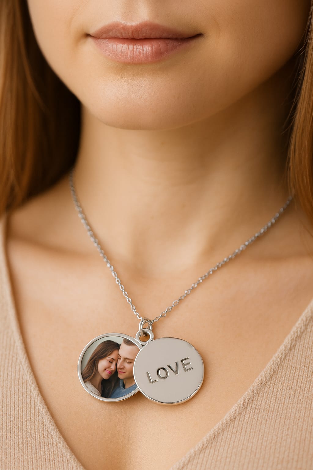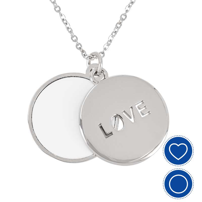 Colgante doble con forma troquelada y placa personalizable por sublimación. Cadena ajustable con cierre mosquetón.
